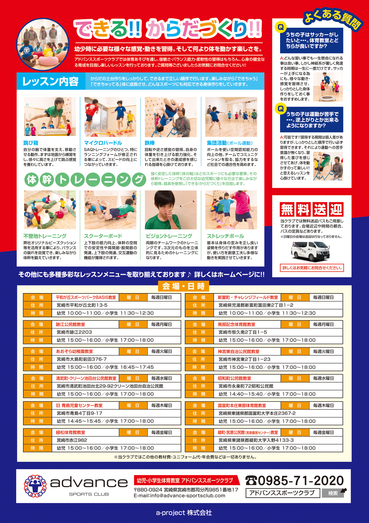 会場(宮崎):[毎週日曜日]平和が丘教室(スポーツパークBASIS平和が丘)・新富町 チャレンジフィールド教室/[毎週月曜日]跡江公民館・南部記念体育館教室/[毎週火曜日]あおぞら幼稚園教室・神宮東自治公民館教室/[毎週水曜日]清武町 クリーン池田台公民館教室・昭和町公民館教室/[毎週木曜日]旧青島児童センター教室・国富町本庄東部体育館教室/[毎週金曜日]緑松体育館教室・綾町・宮原公民館教室(宮原農営センター)