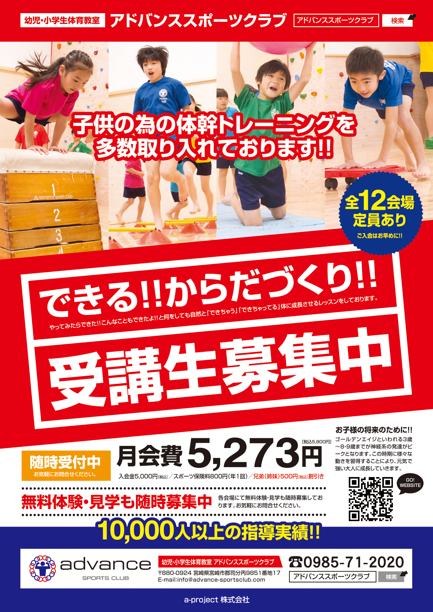 宮崎にある体操(スポーツ)の 幼児小学生体育教室 アドバンススポーツクラブでは、やってみたらできた!!こんなこともできたよ!!と何をしても自然と「できちゃう」「できちゃってる」体に成長させるレッスンをしております。