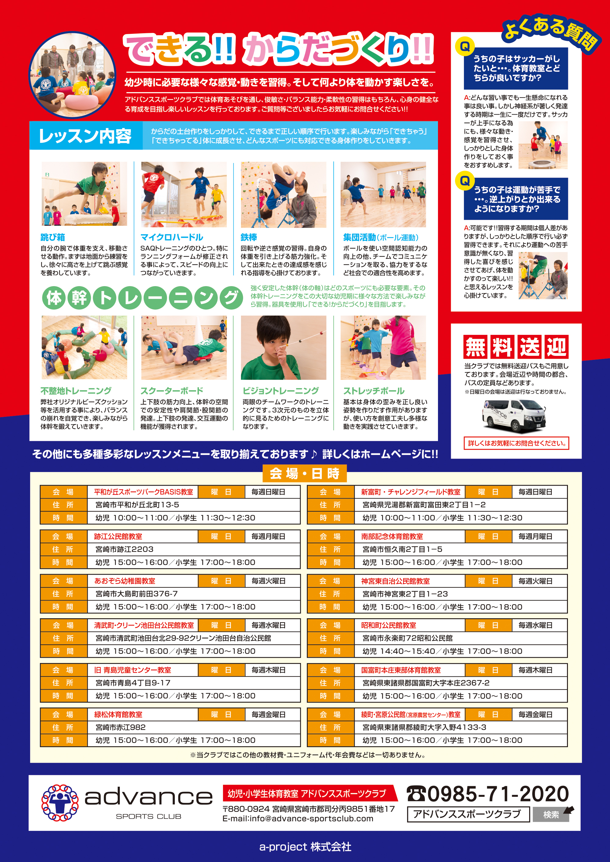 会場(宮崎):[毎週日曜日]平和が丘教室(スポーツパークBASIS平和が丘)・新富町 チャレンジフィールド教室/[毎週月曜日]跡江公民館・南部記念体育館教室/[毎週火曜日]あおぞら幼稚園教室・神宮東自治公民館教室/[毎週水曜日]清武町 クリーン池田台公民館教室・昭和町公民館教室/[毎週木曜日]旧青島児童センター教室・国富町本庄東部体育館教室/[毎週金曜日]緑松体育館教室・綾町・宮原公民館教室(宮原農営センター)